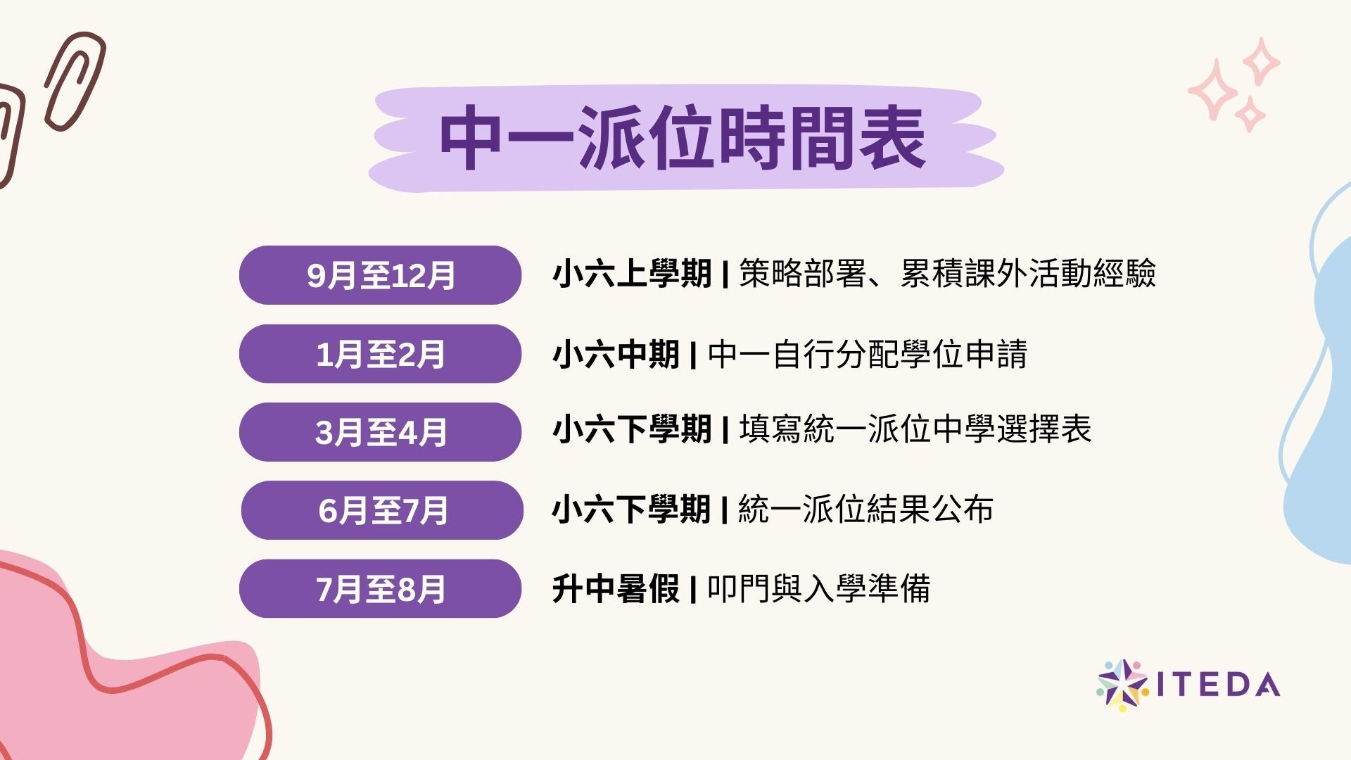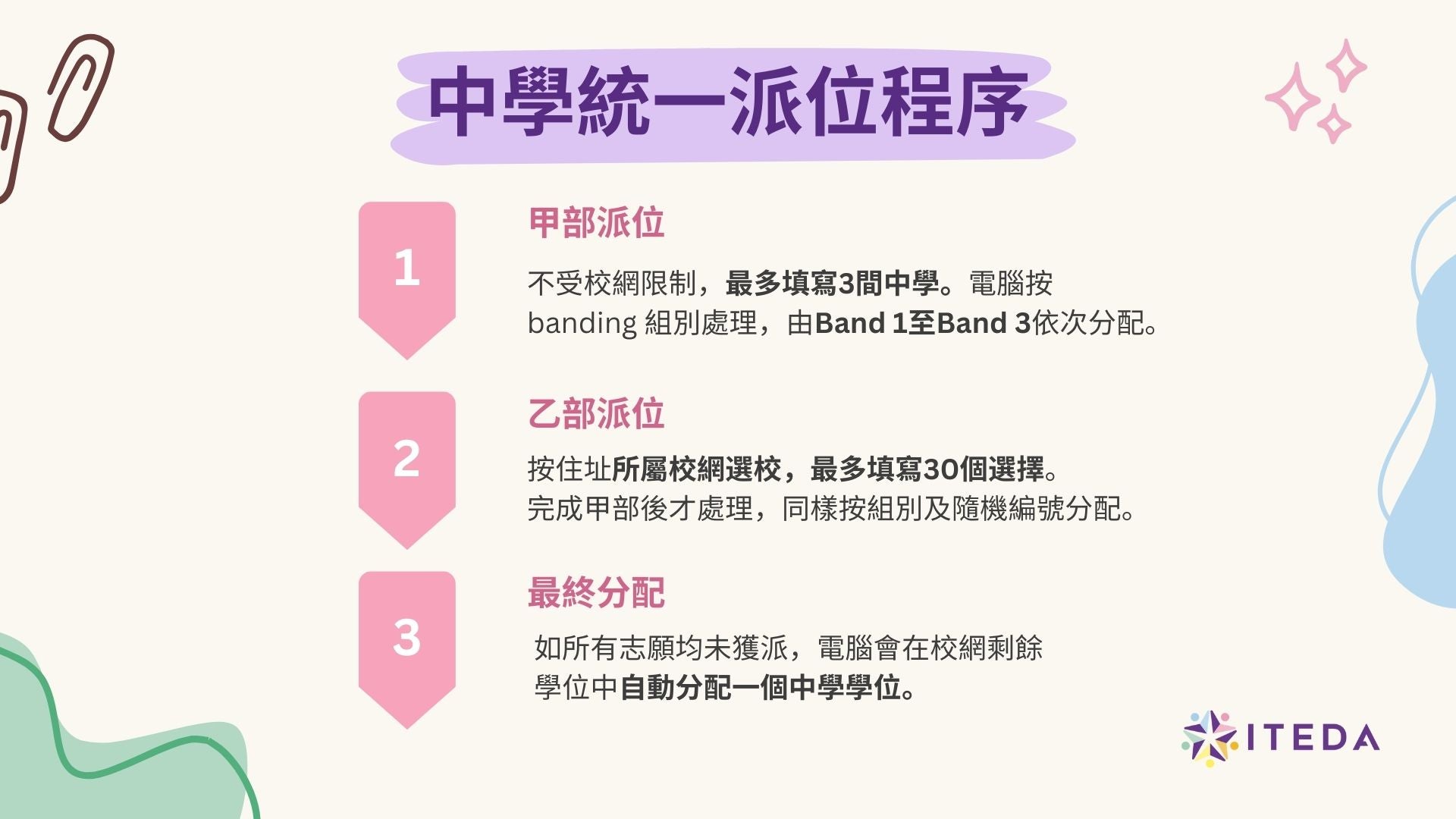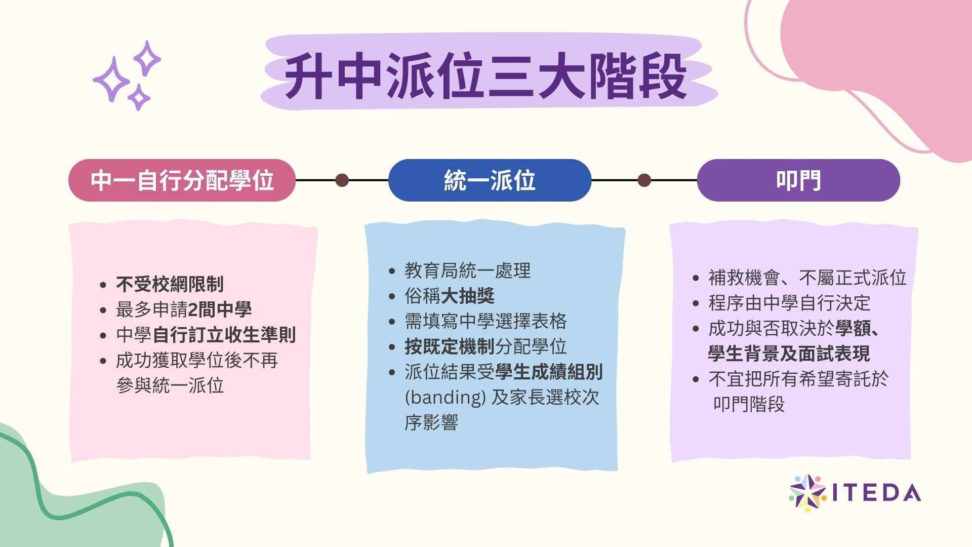 ITEDA 為家長整理了最新升中派位的詳細資訊,羅列了「自行分配學位」、「統一派位」以及「叩門」的重點、選校策略和重要日期。